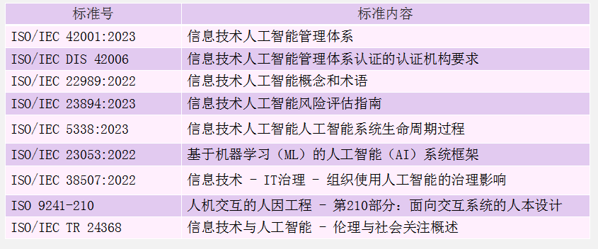 為應(yīng)對(duì)各個(gè)國(guó)家的人工智能法案要求,我們制定了很多相對(duì)應(yīng)的管理國(guó)際標(biāo)準(zhǔn),如下圖所示: