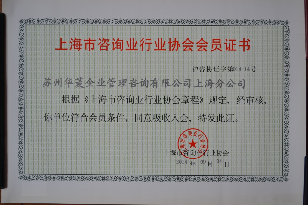 為精心立足上海,作為一家上海本地化的咨詢機(jī)構(gòu),經(jīng)上海市咨詢協(xié)會(huì)的資格審查和業(yè)績(jī)的考核,決定批準(zhǔn)上海華菱咨詢?yōu)樯虾W稍儤I(yè)行業(yè)協(xié)會(huì)的正式成員。協(xié)會(huì)期待上海華菱咨詢能更好有服務(wù)于上海的本地企業(yè),并成為上海本地化的領(lǐng)先優(yōu)秀管理咨詢機(jī)構(gòu)。